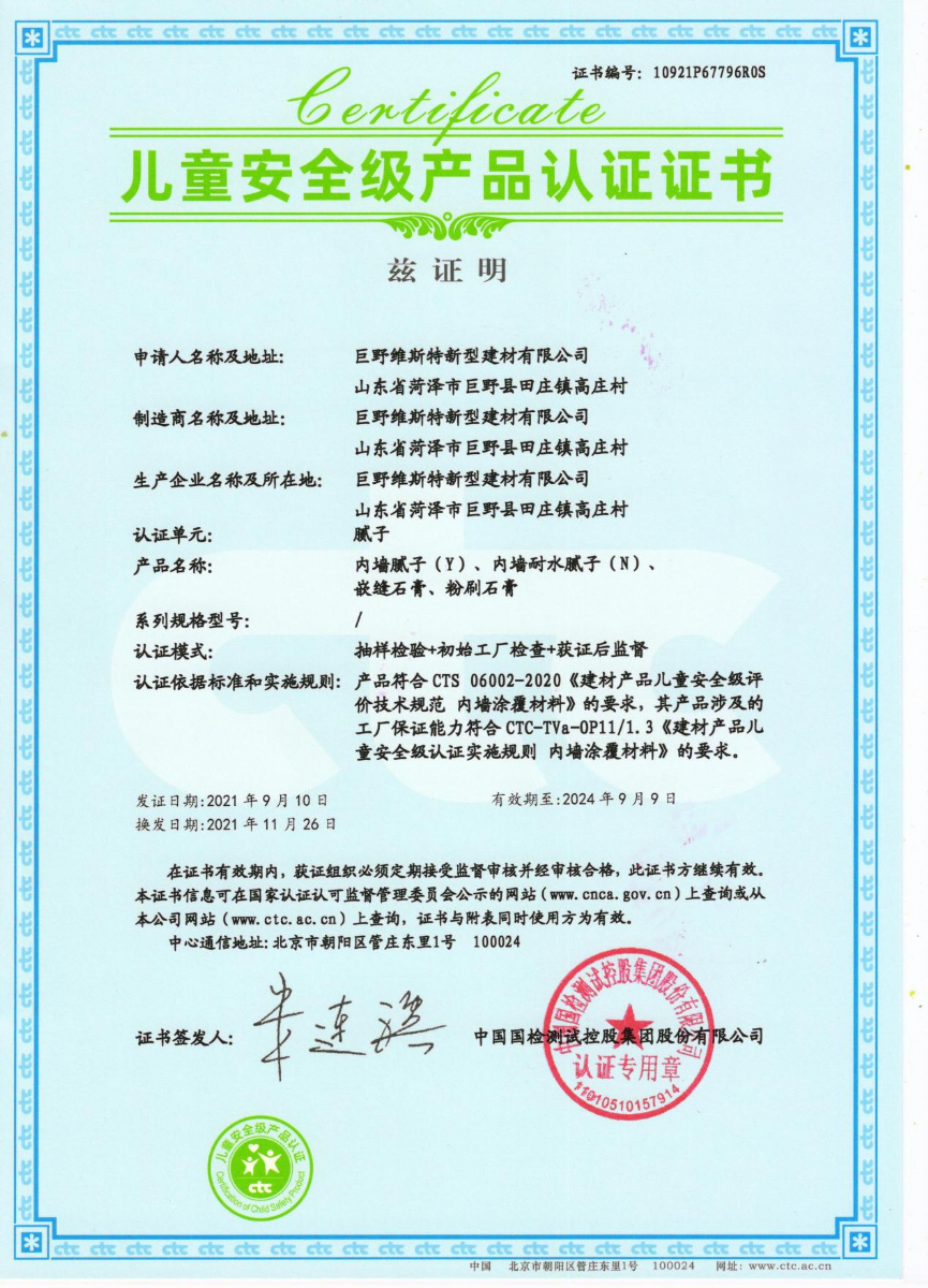 该系列通过中国建材中心颁发的“儿童安全级认证证书”。(该证书是行业内第二个荣获儿童安全认证产品),voc(挥发性有机化合物)、甲醛甲苯以及重金属含量检测标准要更加严格,产品符合《建材产品儿童安全级评价技术规范 内墙涂覆材料》要求。